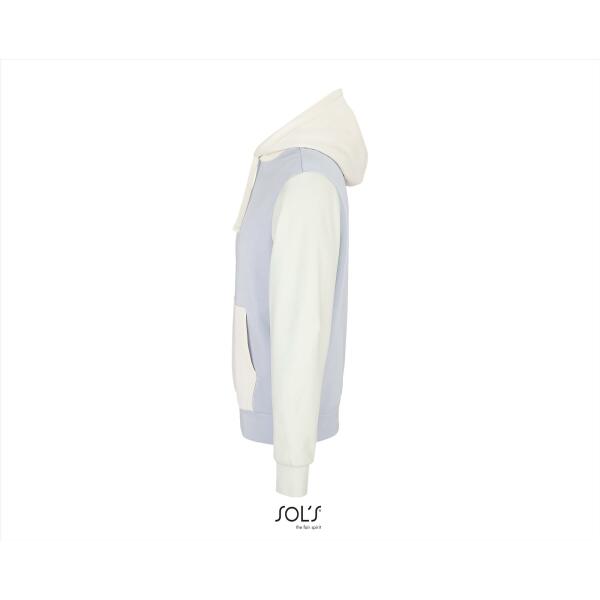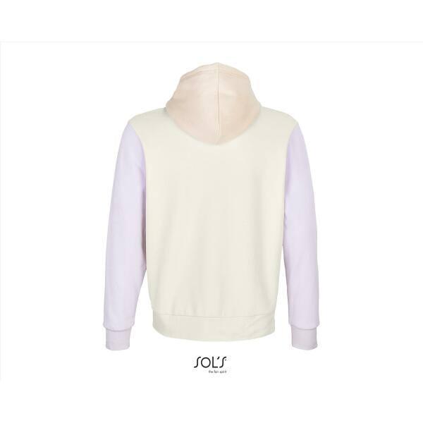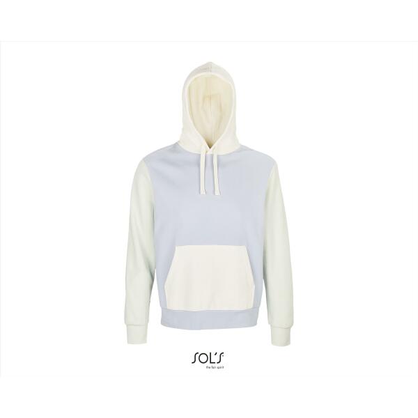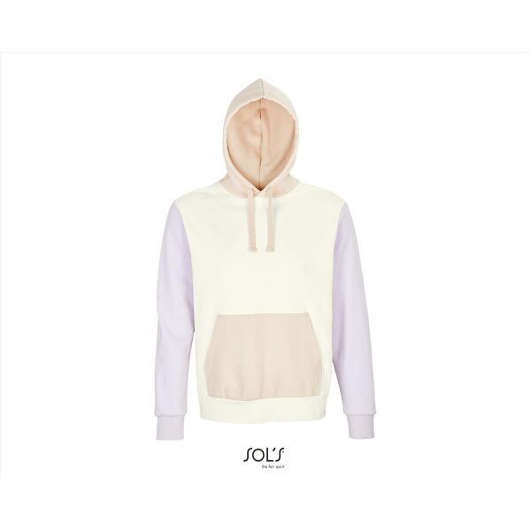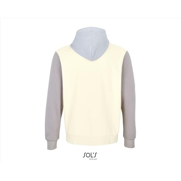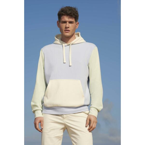 Een duurzame hooded van 'In-conversion'katoen en gerecycled polyester in een unieke 3-kleurencombinatie! Driekleurig sweatshirt. Kangoeroezak. Gevoerde capuchon met trekkoord. 1x1 ribboorden en zoom. Halve maan binnenkraag. Boord.