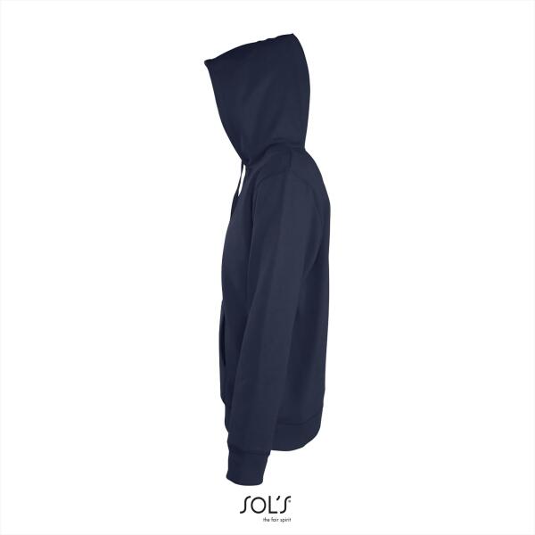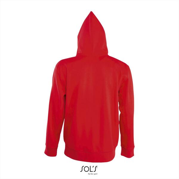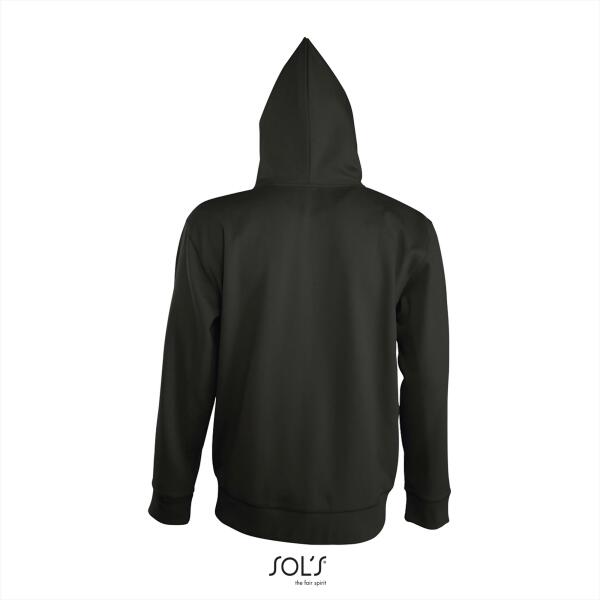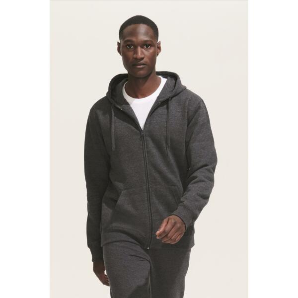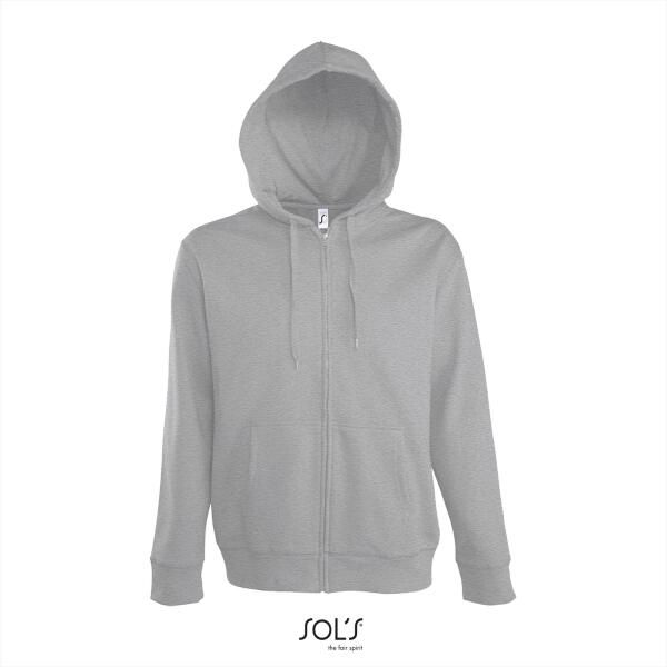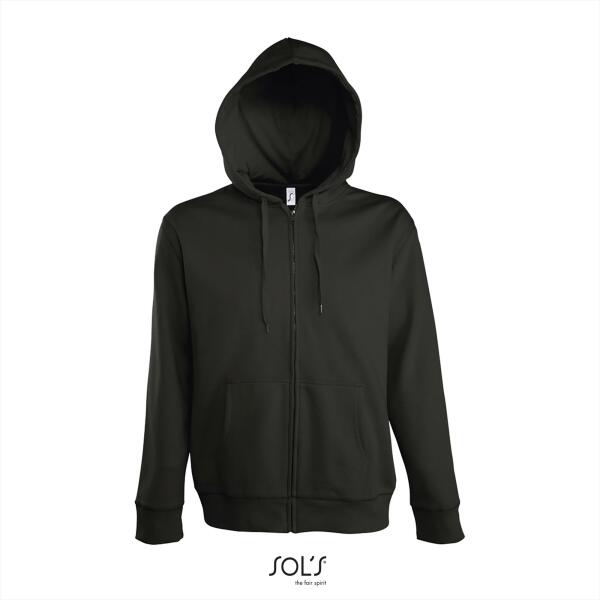 Heren sweater met rits en een gevoerde capuchon. Brushed. 2 zakken. Ribboorden met elastaan. Gevoerde capuchon met plat koord kleur op kleur. Verborgen rits. Recht gesneden.