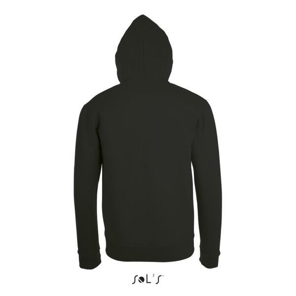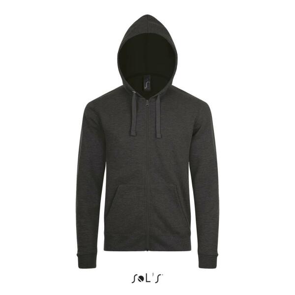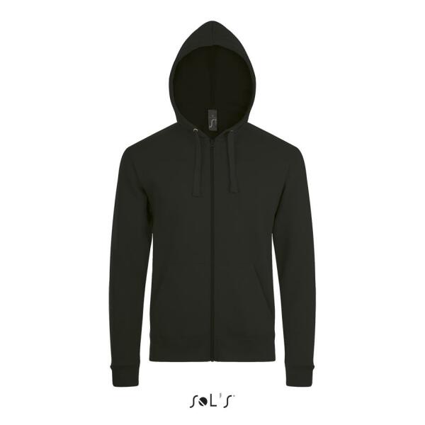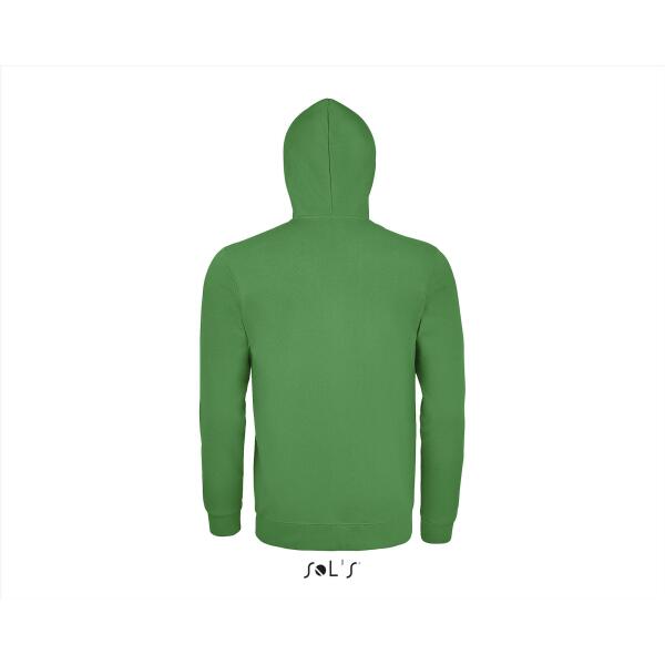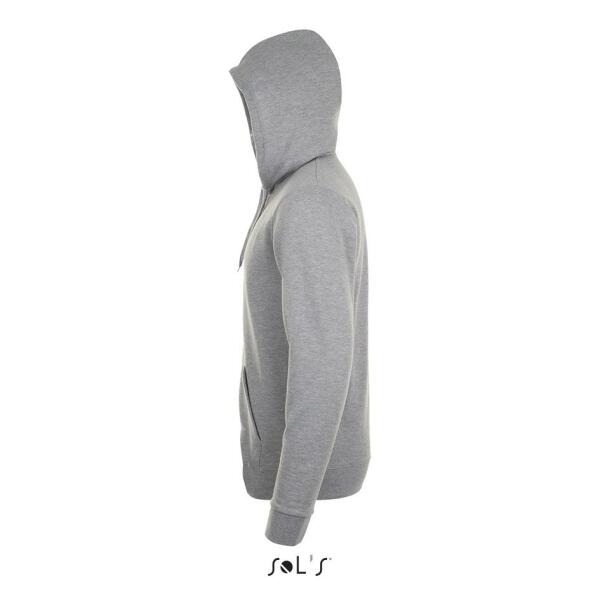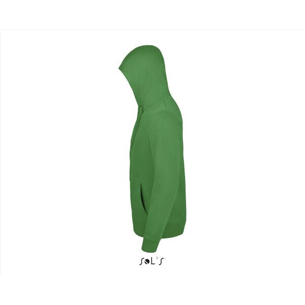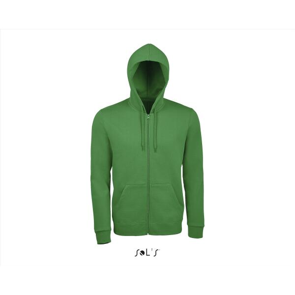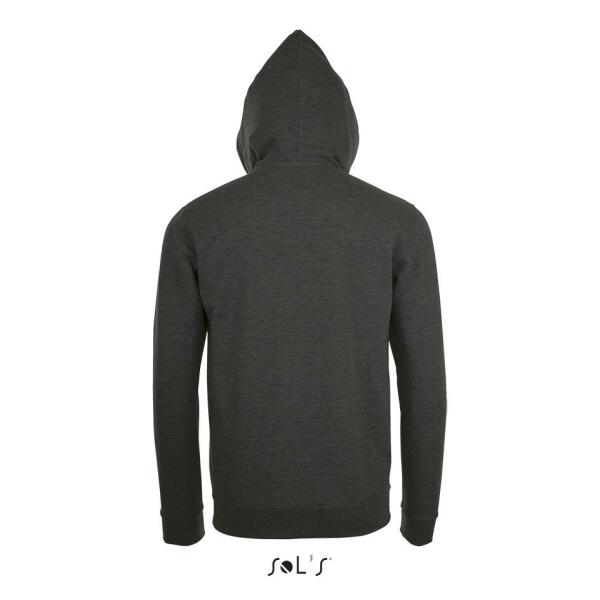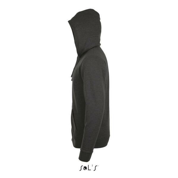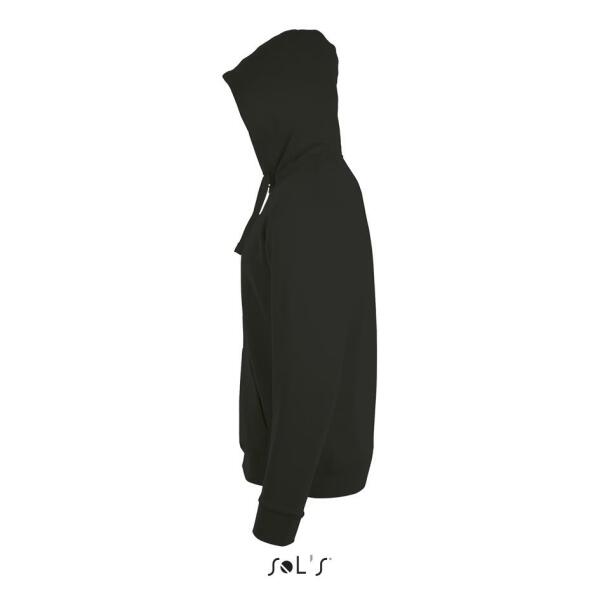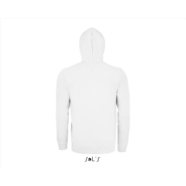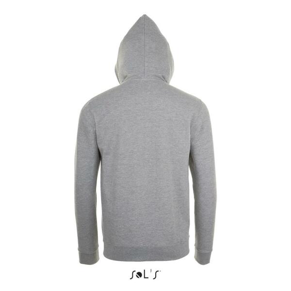Sweat jacket met hooded met dezelfde kleur aantrektouw. Opgenaaide mouwen. 2 kangoeroezakken, rechte snit.