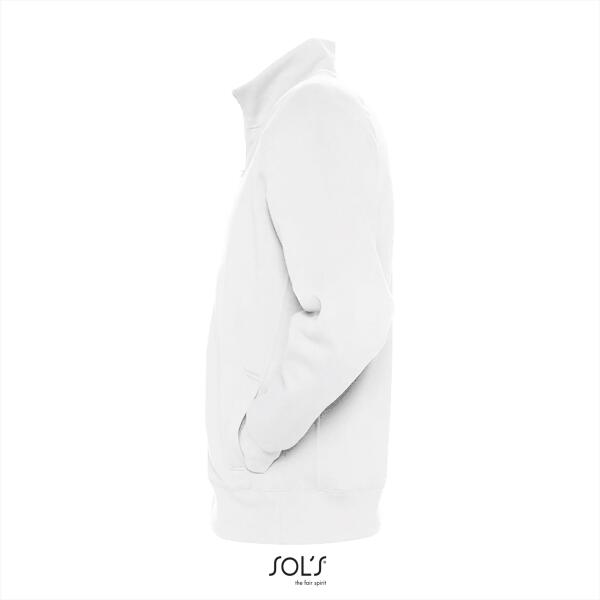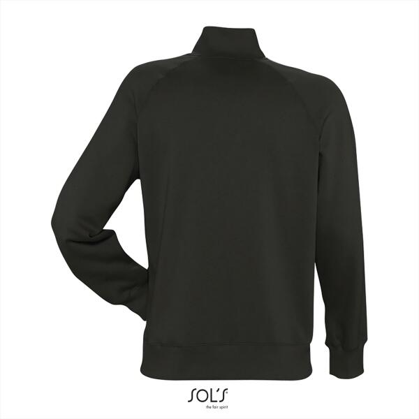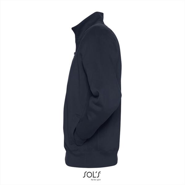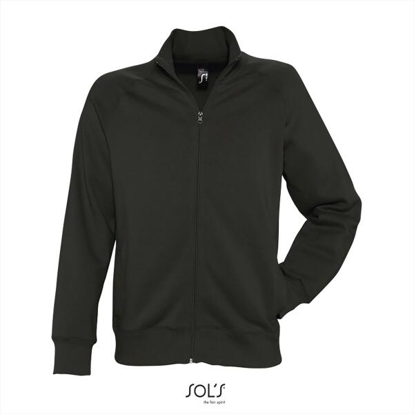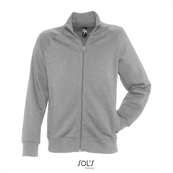 Trendy heren sweat jacket. Brushed. 2x2 ribboorden met elastaan. Raglanmouwen met sierstiksels. 2 zijzakken. Hoge kraag.